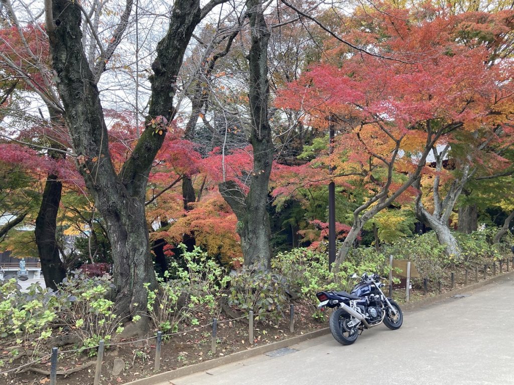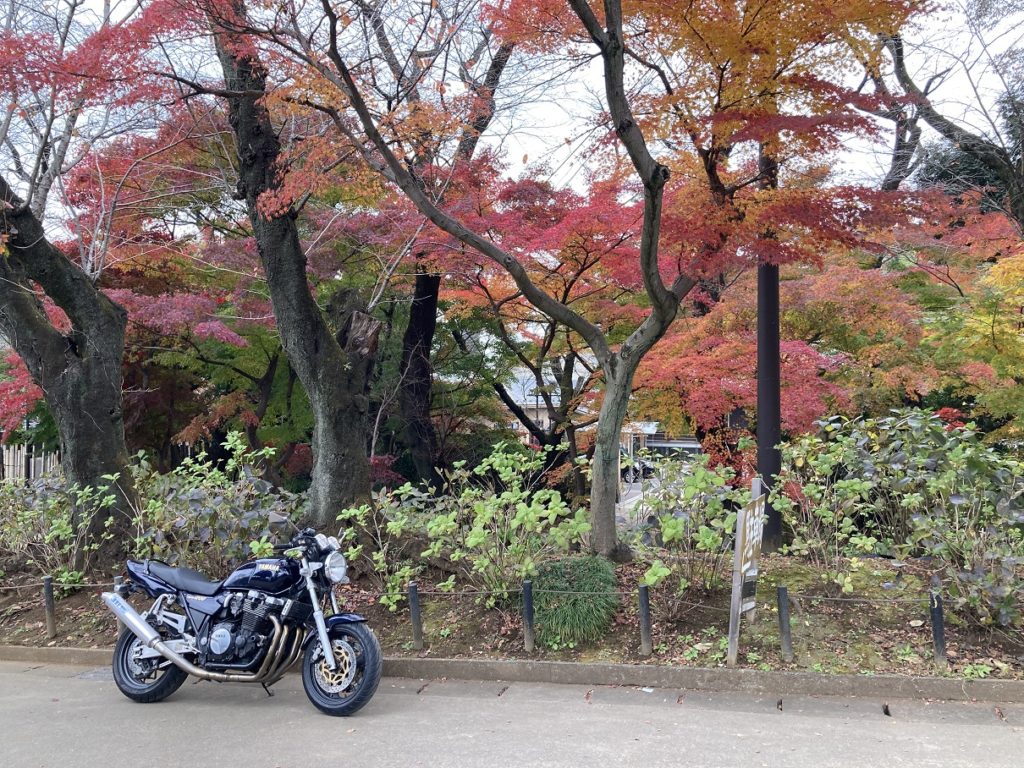 境内を出て、帰り際に仁王門脇の紅葉を背景に、XJRを撮りました。