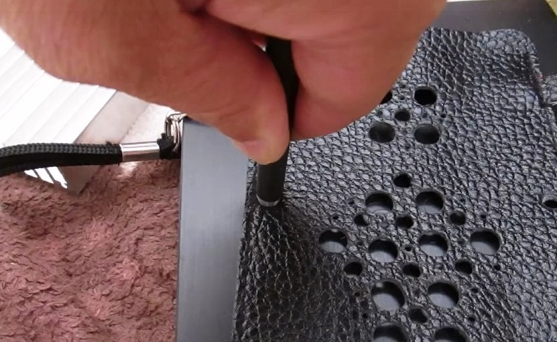 ポンチをつかって開けます。開ける場所は中に入れるステンレス板に既に開けている穴がありますので、同じ場所、同じ大きさにします。