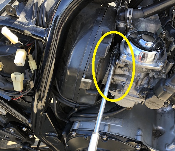 それがなんか症状が再発してしまったような感じなのです。取りあえず停車し、確認してみると、なんとエアクリボックスとキャブを繋ぐジョイントのバンド、ここですね↓
