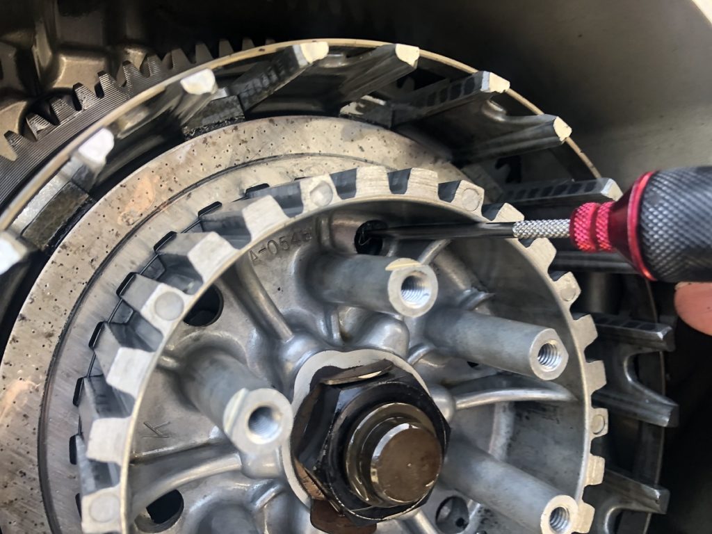 スプリングハウジング、プレッシャープレートを入れて、クラッチスプリングをプレートワッシャーで抑えて、ボルトで留めます。仮締めの段階から対角線状に交互に締めていきます。