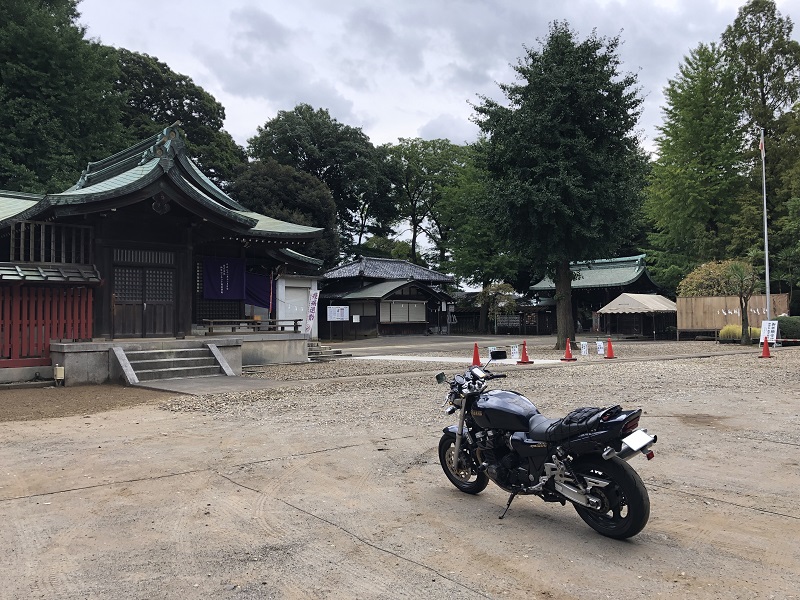 XJRを停めたのは本殿の左脇の駐車場です。意味もなく無性に撮りたくなってしまう、ライダーあるあるの行動を、また取ってしまいました(=゚ω゚)ノ