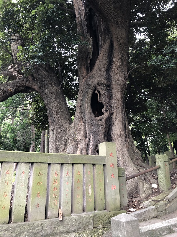 川口市にある峯ヶ岡八幡宮はとても自然豊かな社叢となっており、その境内には市の保存樹木に指定されている木が多く存在しています。確かに、神社の鳥居手前には、立派なスダジイがありました。