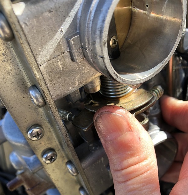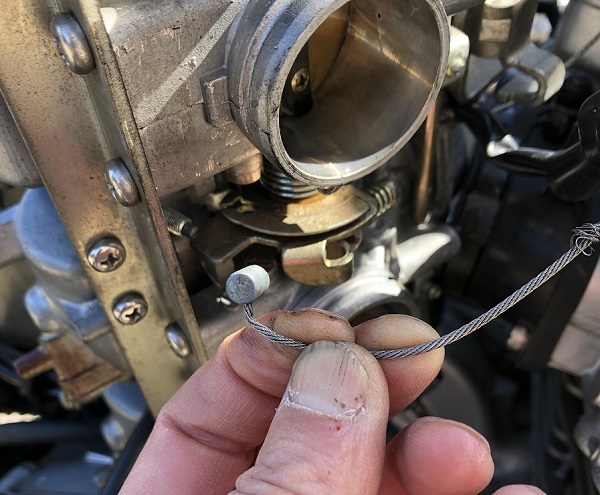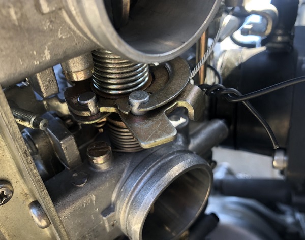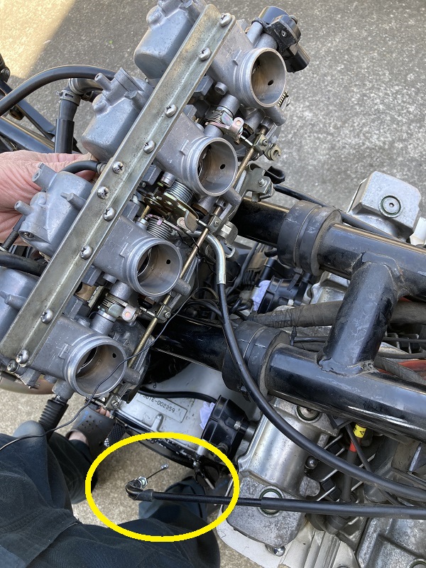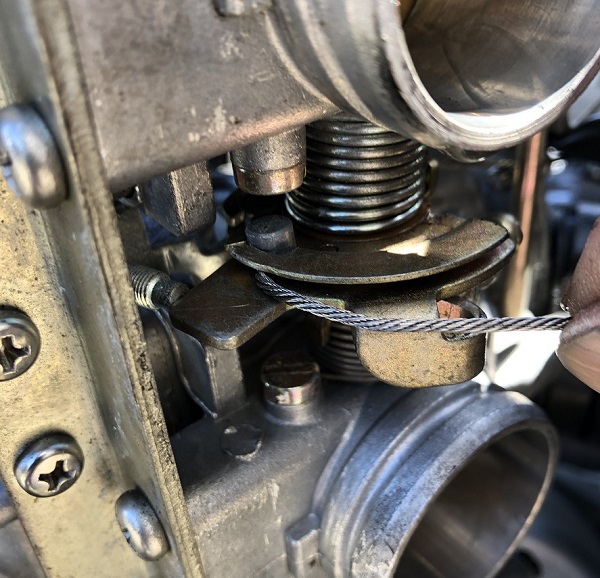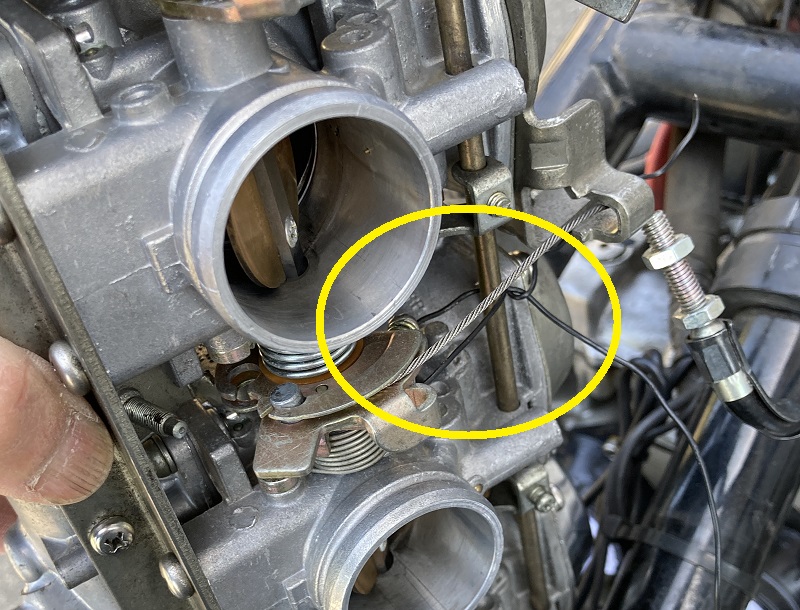 アクセル戻しのリターン側ワイヤーはキャブの裏側に留まっています。