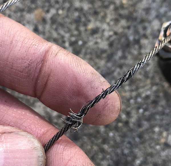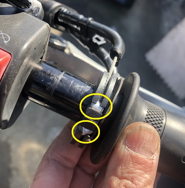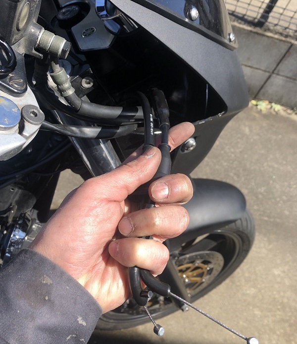 外れました。引っ張り側のワイヤーです。ツーリング中に切れてたらと思うと、あらためてぞっとしました。