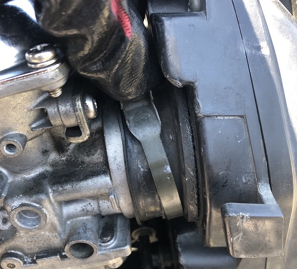 キャブを戻す際は、きちんとはまっていることを確認しないと、2次エアーの吸い込みでエンジン不調の原因になります。特にエアクリーナーとのジョイントゴムは柔らかく、中ほど2つの下側は見えにくいので要注意です。
