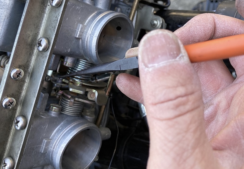 アクセルワイヤーを緩めているので、裏側にはまっているワイヤー先端がはまっている箇所も、ピンセットプライヤー等を使えば比較的容易に外すことが可能になります。