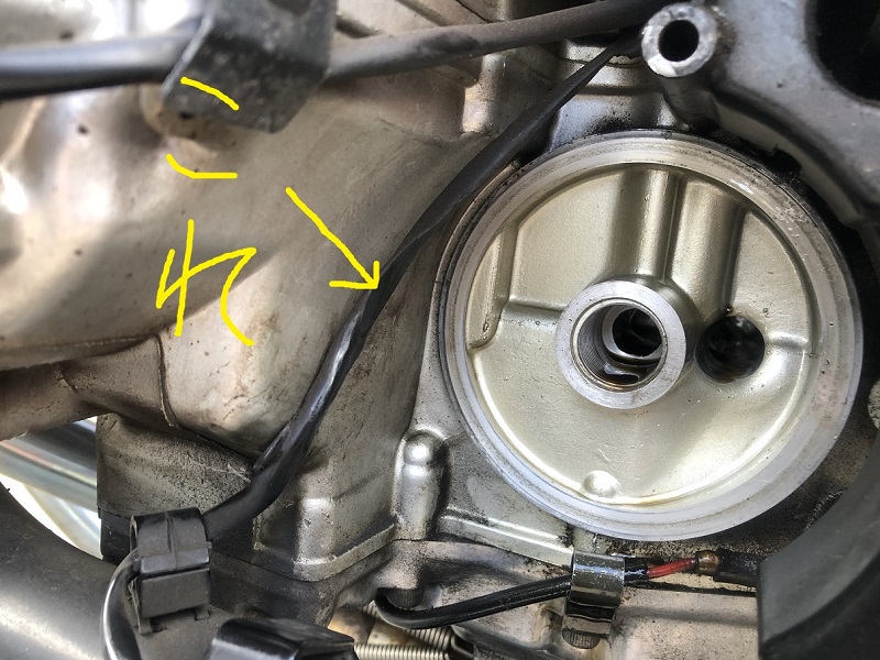 取りつけの際に要注意箇所があります。これ、サイドスタンド上げ忘れエンジンストップスイッチの配線になりますが、ケースを取りつける際、この配線を巻き込んで取り付けてしまう恐れが多分にあります。私以前、一度やりかけました(;´・ω・)。このスイッチがオンになった状態では、ギアを入れてもエンジンが止まらない設計になっています。つまり、配線が切れてしまうと、