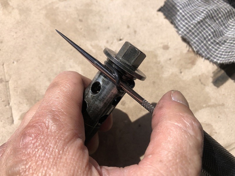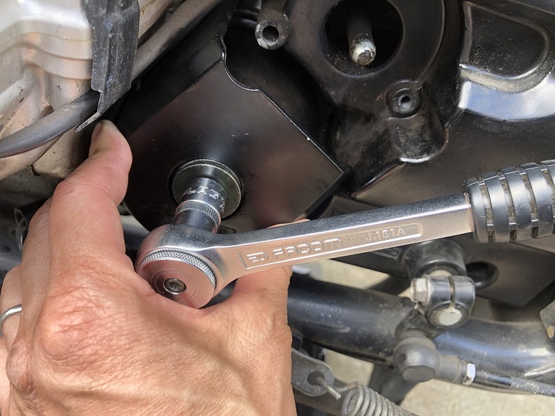 小さめのモンキーレンチでオイルプラグを外します。