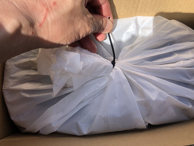 最後に燃えるゴミをオイル処理ボックスに入れ、タイラップで留め、テープで箱のふたを貼ったら、終了です。