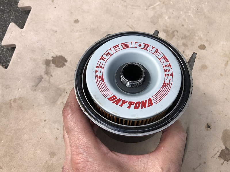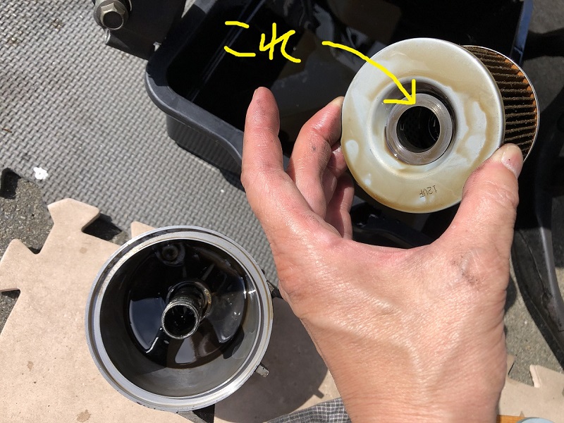フィルターケースを外し、中からオイルフィルターを取り出します。フィルターの底に、ワッシャーが付いていますので、これを無くさないようにとっておきます。ワッシャーが付いたままフィルターを捨ててしまうことが多いようです。